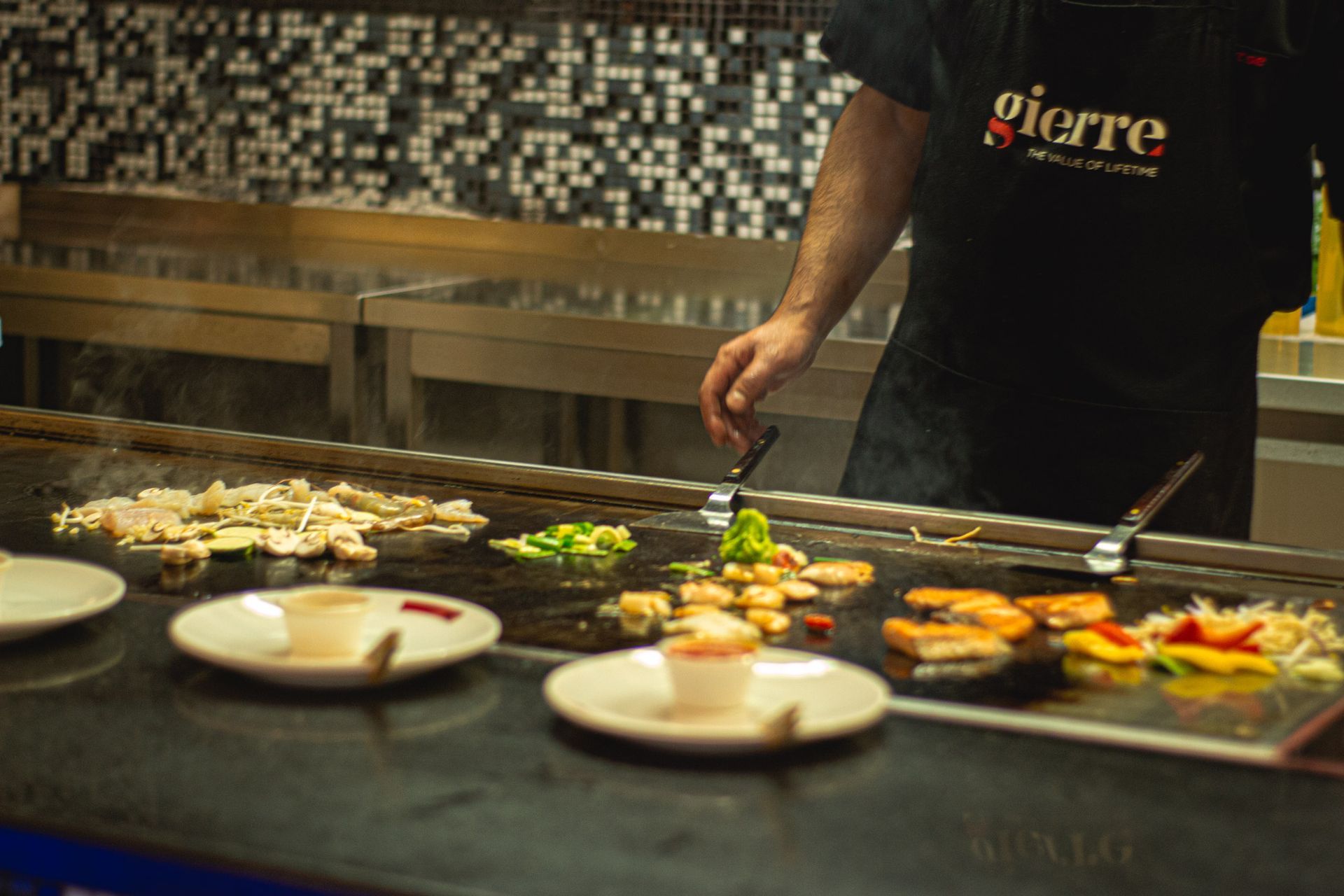 You can choose from various vegetables and different types of meat and fish: there are lamb chops, rump steak and shrimps, among others.